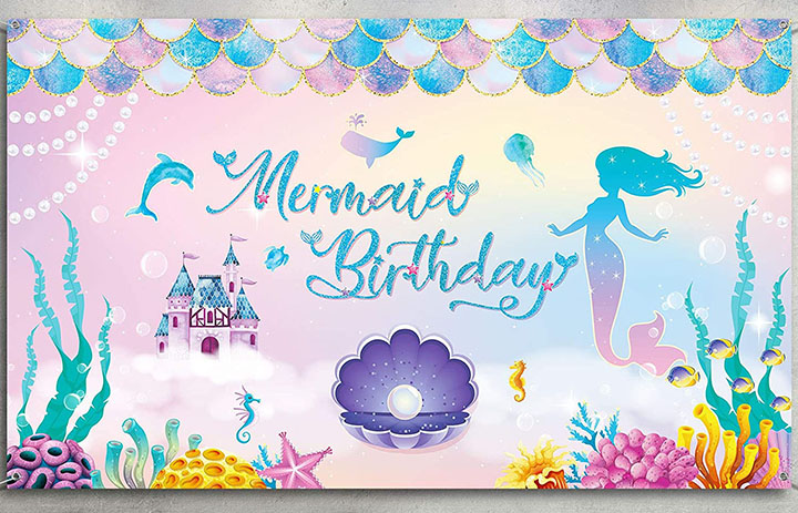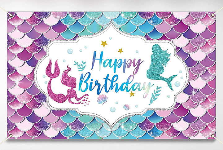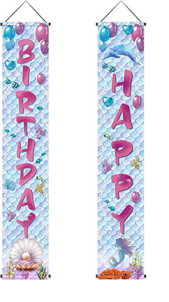 Including in the mermaid birthday banners is 6′ x 3′ banner, a 6′ x 3 1/2′ banner, two 71″ x 12″ hanging Happy Birthday banners and an inflatable 6′ Happy Birthday cake (not mermaid themed). The cost is $15 for our mermaid themed decorations.